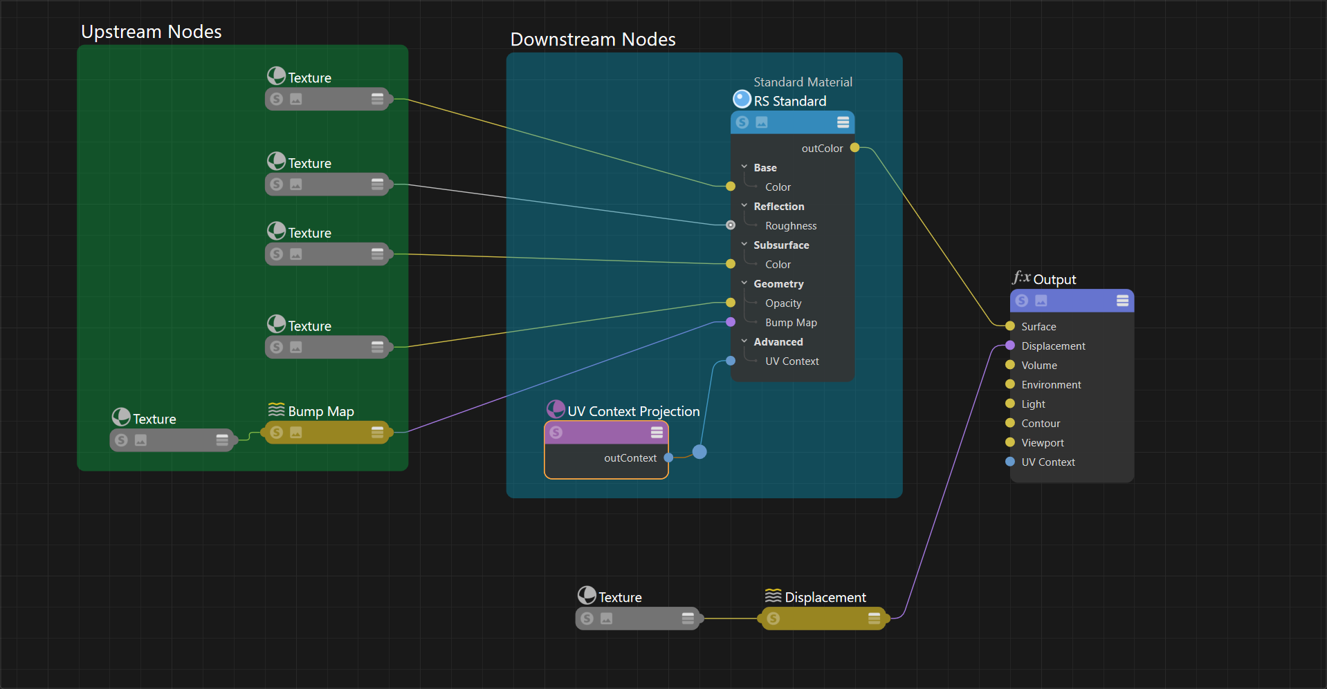 | Downstream connections UV Context Projection connected to the Material Output node All textures connected to the Material and Displacement shaders are upstream |