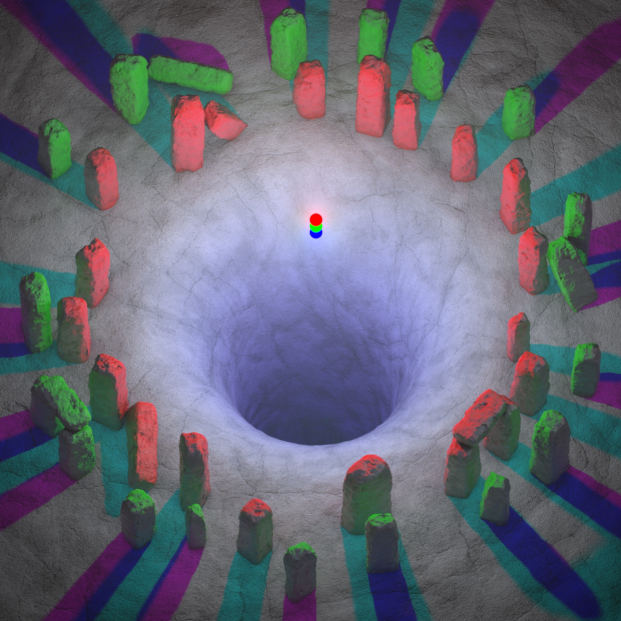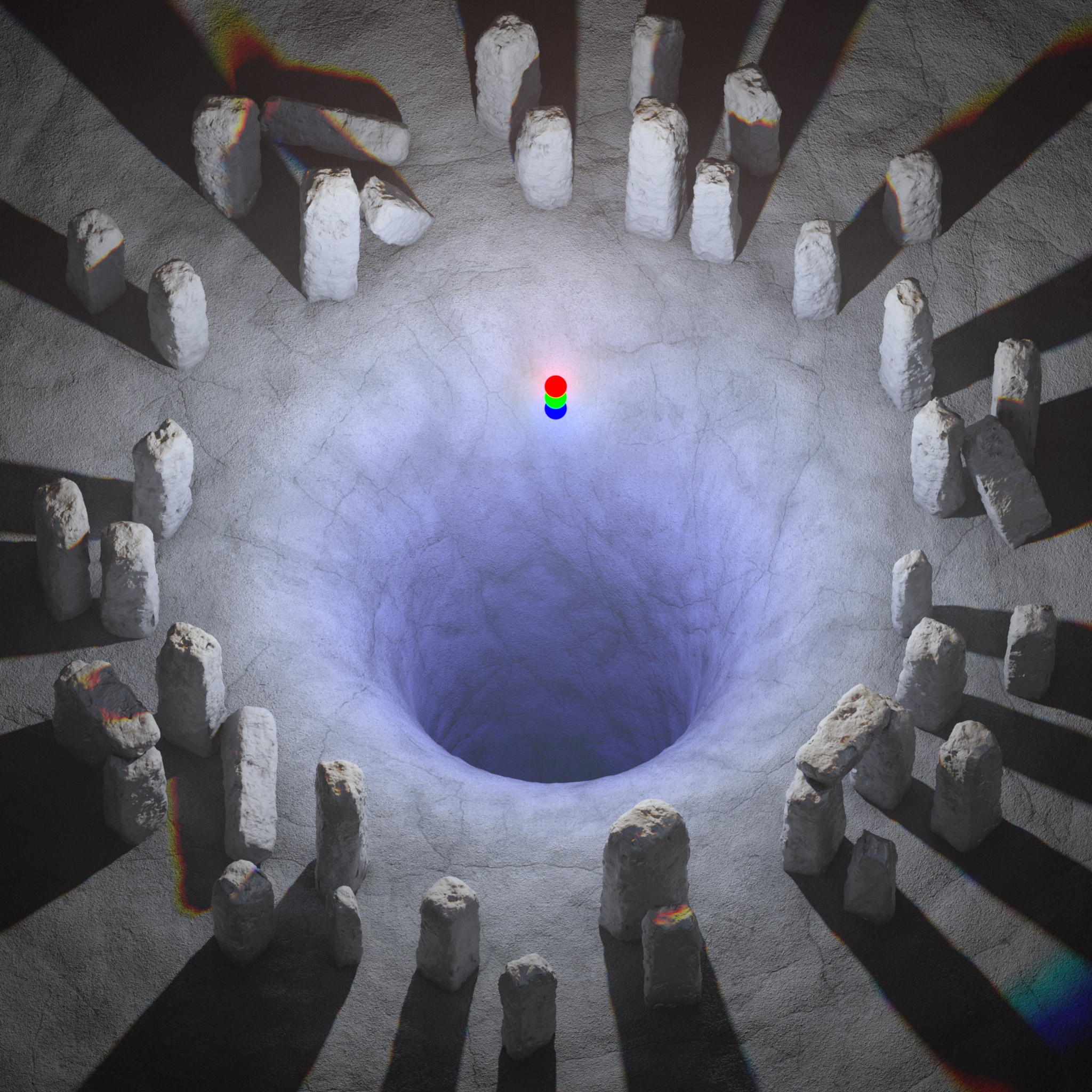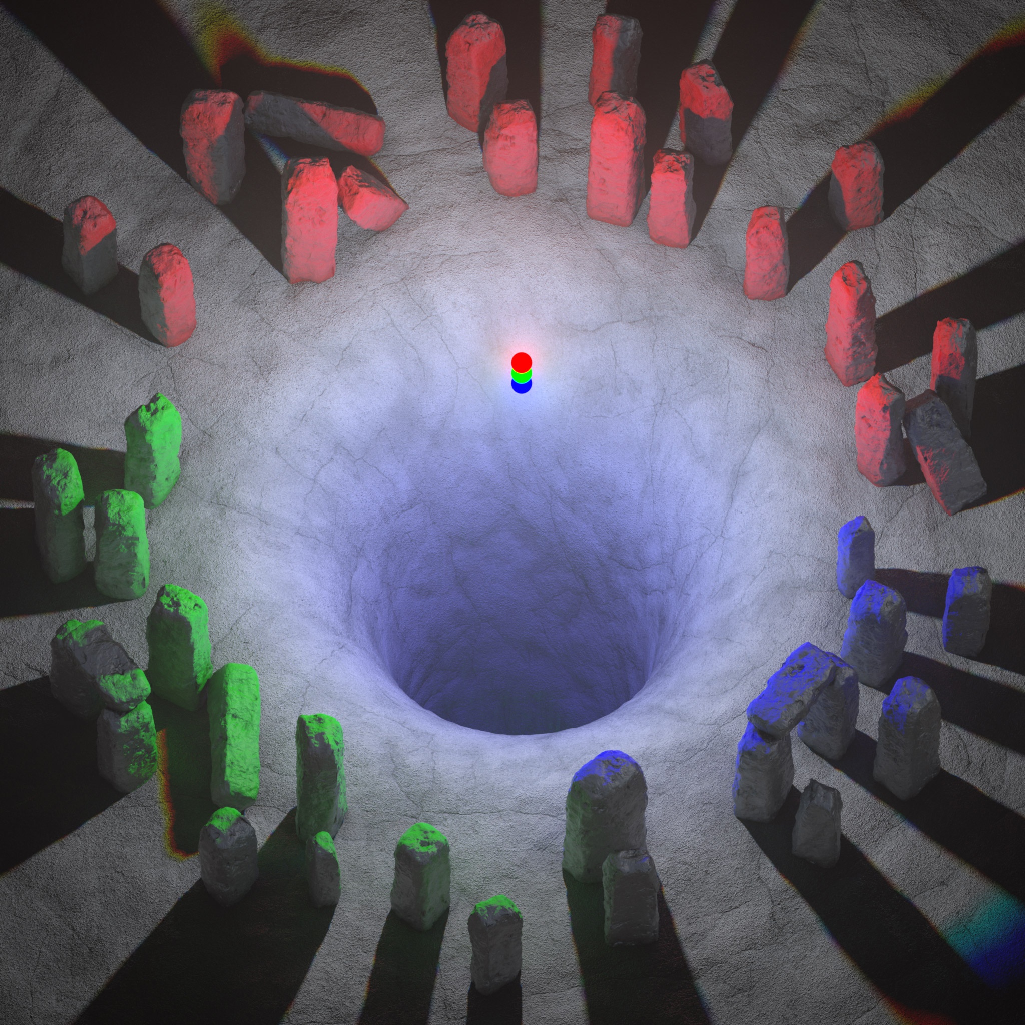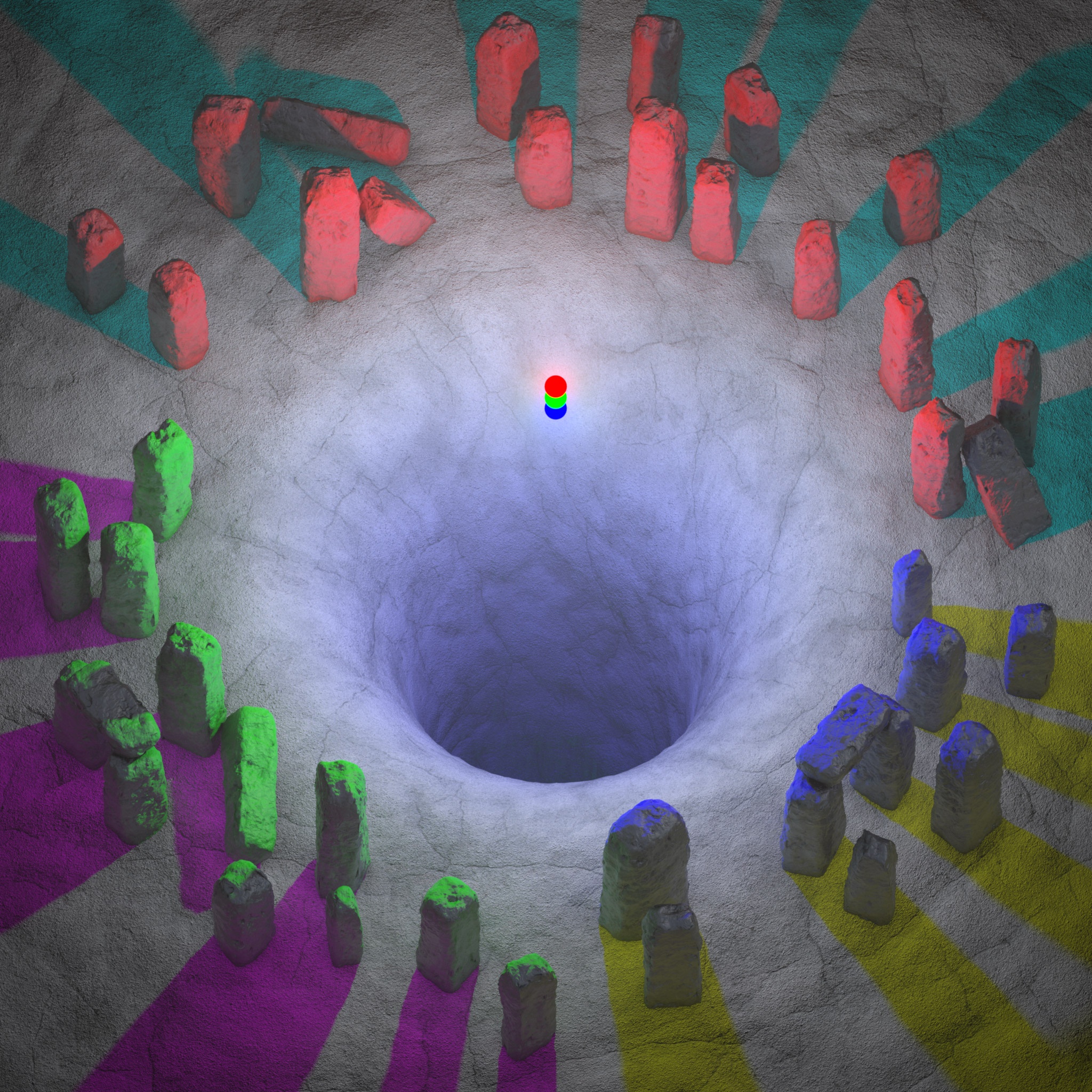 As you can see above, the rocks have been split up into thirds each with their own light exclusively affecting each third. The ground object remains affected by all 3 lights which is why the shadow color of each rock section is the additive result of the remaining lights still casting in this area. For example, the red rocks at the top of the image are receiving light and casting shadows from the red light alone, however, the blue and green lights are still casting light in this shadowed region resulting in cyan colored shadows.