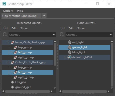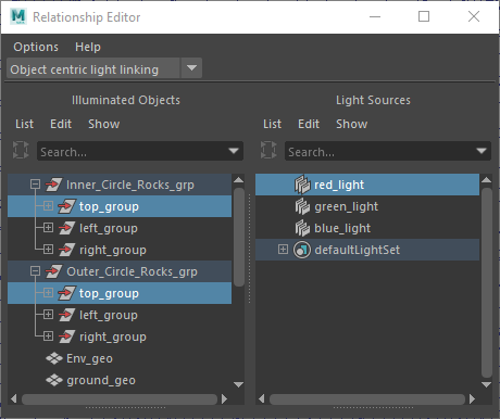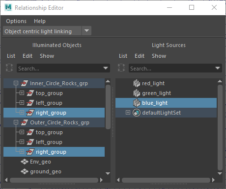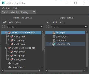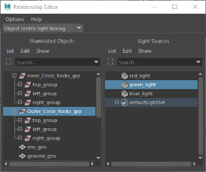 For another example, the inner circle of rocks and outer circle of rocks will be linked to completely separate lights to demonstrate another potential side effect of light linking. The inner circle of rocks is linked to the red light and the outer circle is linked to the green light as pictured below while the blue light excludes all the rocks as pictured below: