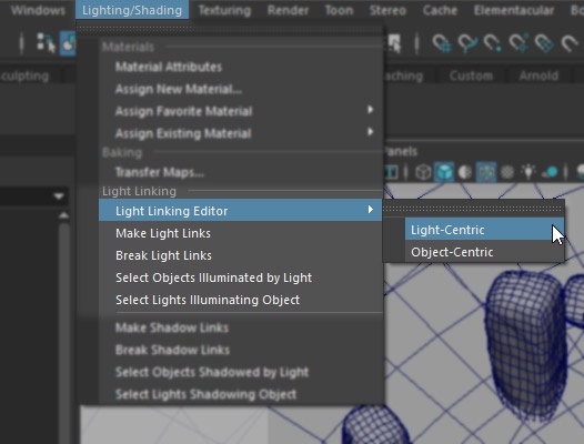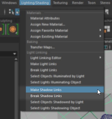 First we need to change the Shadow Linking Mode to "Use Shadow Links" and then we need to actually break the shadow links for the specific lights. To do so in Maya you have to select the relevant objects and the lights that you want to make or break connections and go to the Lighting/Shading menu and use the appropriate Shadow Linking options pictured below:
