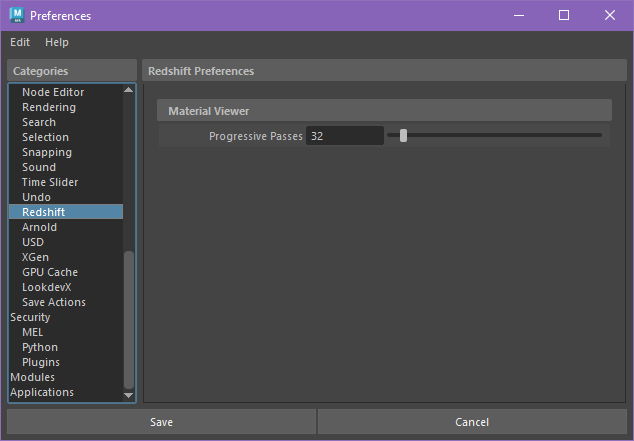 The quality of the Material Viewer can be controlled by changing the number of Progressive Passes that the Material Viewer can reach. This is managed in the Redshift section of Maya's Windows > Settings/Preferences> Preferences as pictured below.