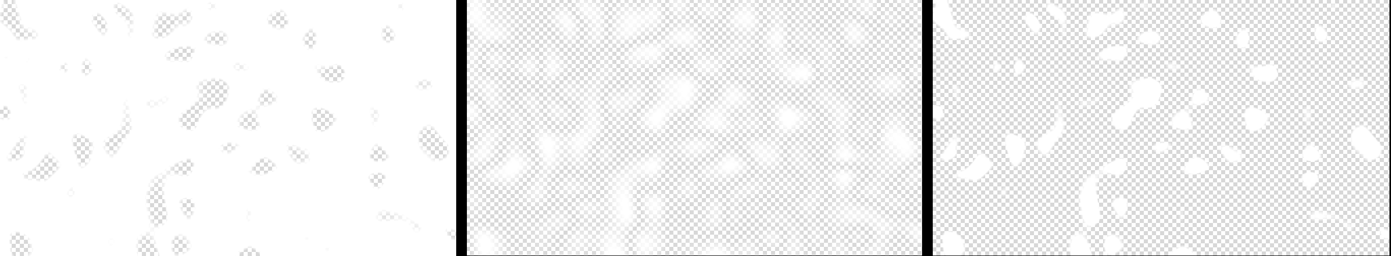 and checked Show Pattern to reveal the effect's noise pattern. Below, you see how Contrast values of -500 (left), 0 (center), and 500 (right) affect this pattern. Notice how -500 is the inverse of 500. When you click Show Pattern for a text layer, the exposed pattern within the text characters may be too small to discern well, which is why we showed the pattern on a plain solid layer.