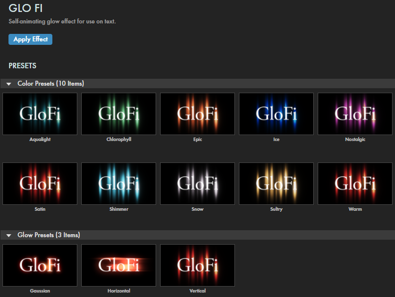 Glow Fi is a self-animating, fractal-based glow effect for text. Add a unique, organic glow with presets and advanced controls.