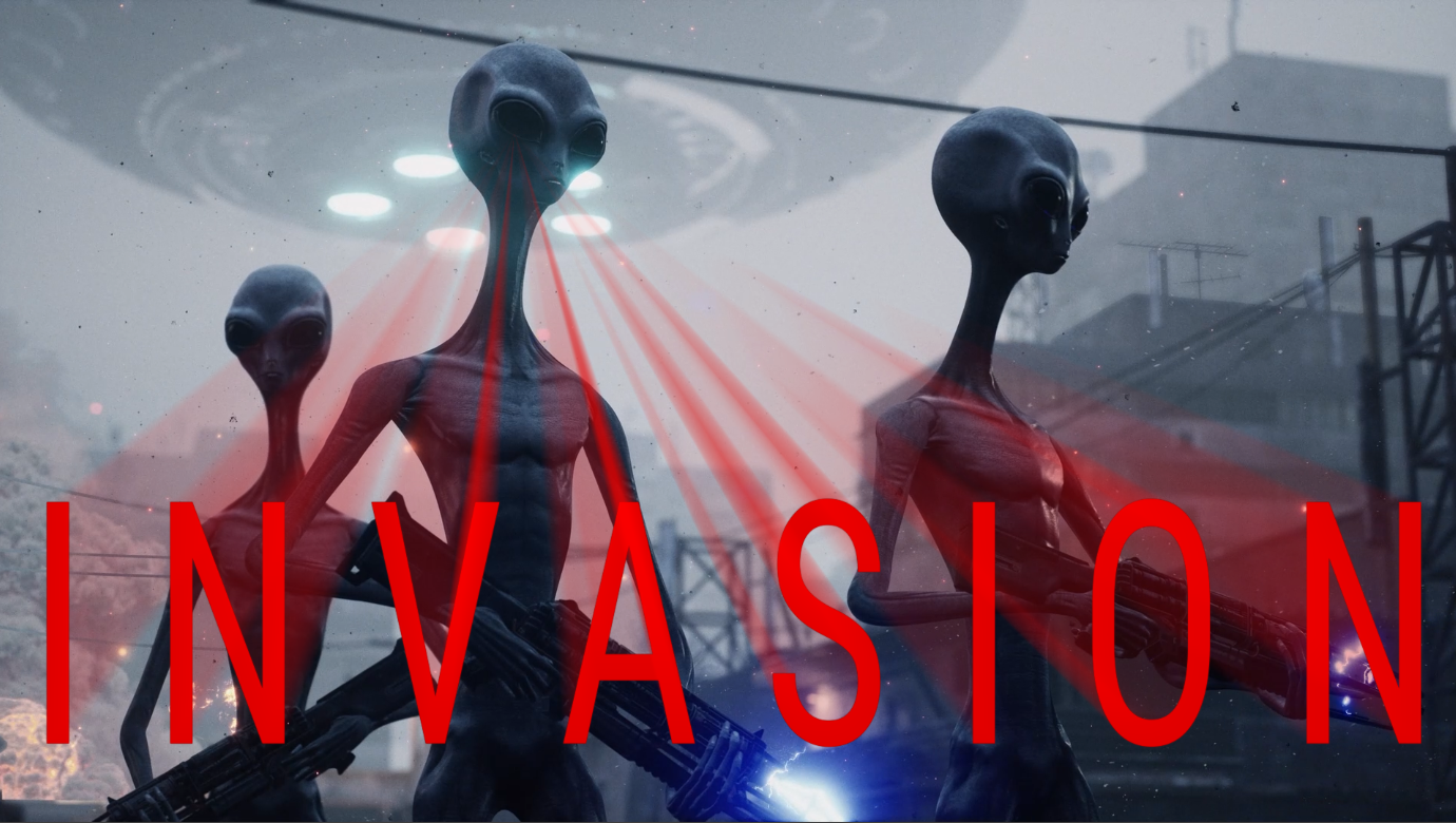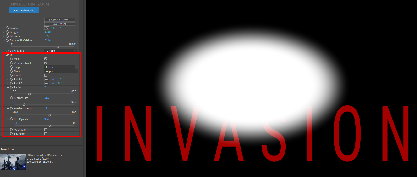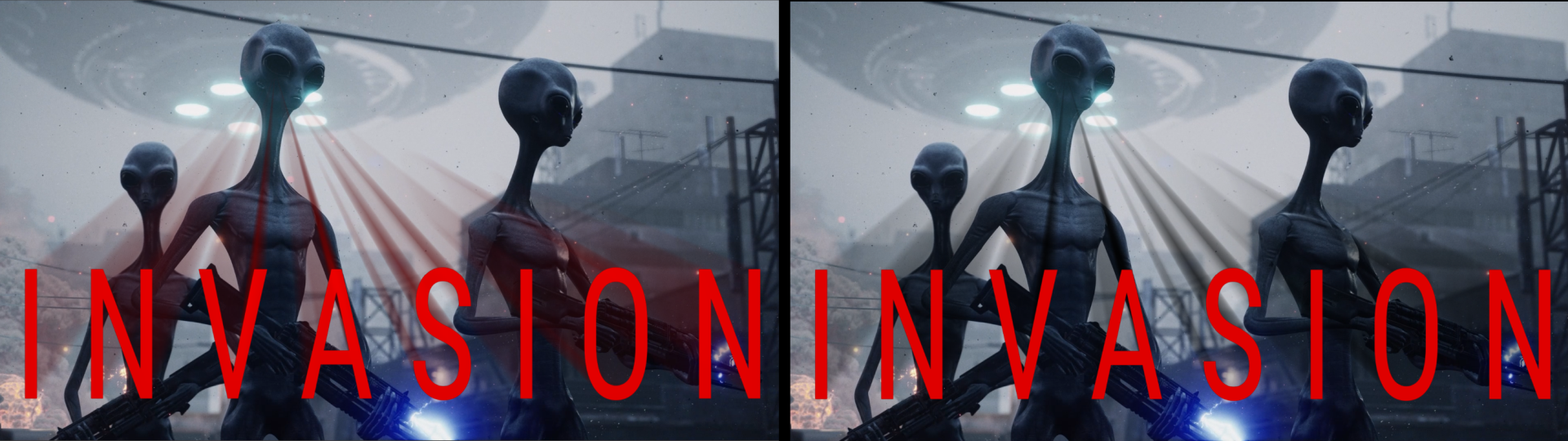 In this example, we wanted the give an impression that the word INVASION was beaming from the alien spacecraft while still not obscuring the alien bodies, so we set the Position point near the spaceship's base.