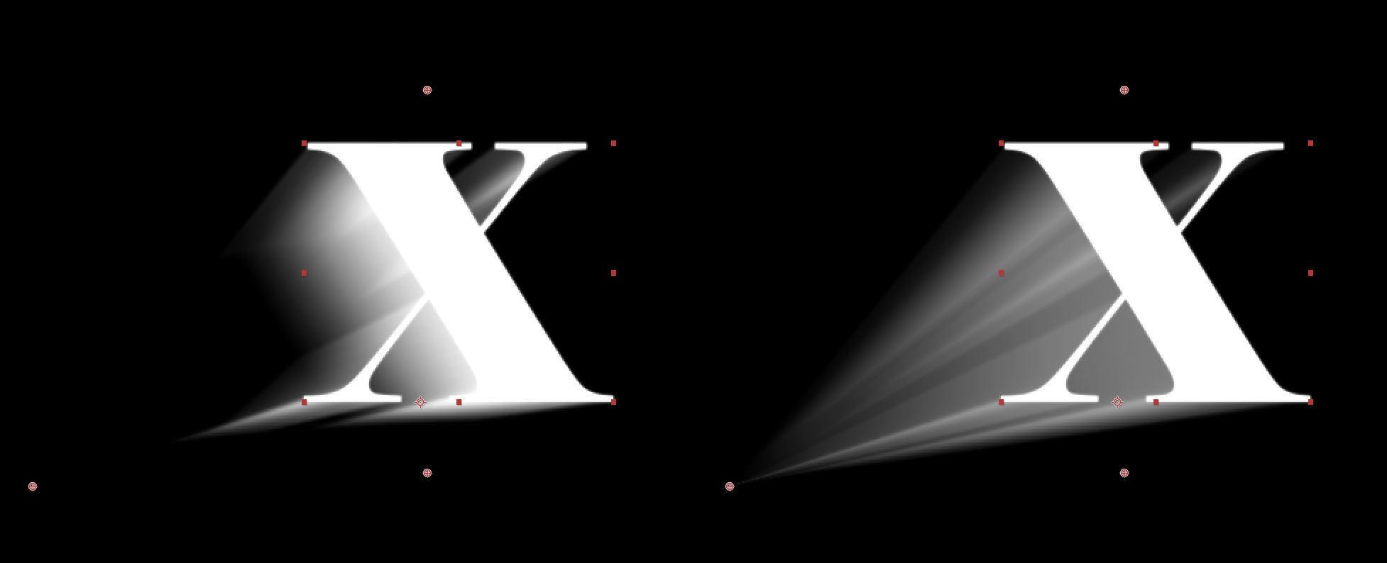 Length allows you to adjust the length of blurred rays from the applied layer's edges to the Position control point. This also applies if the point is positioned beyond the applied layer's edges. The image below compares Length values of 100 (left) and 300. Notice how the longer glow helps more clearly define the source's edges.