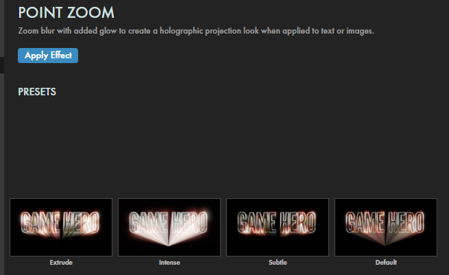 Use zoom blur with added glow to create a "holographic projection" look when applied to text or images. Create the illusion that your object is coming from a light source.