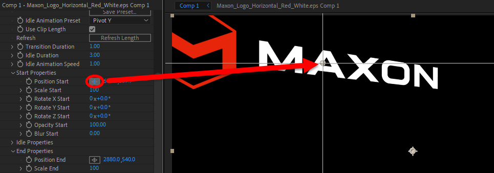 Position Start. Type in x and y values for the position or use the cross-hairs to drag the start point to where you want. The image below shows our logo's position at the beginning of its entrance. Note how most of the logo is already visible because we placed the start point well within the comp's boundary.
