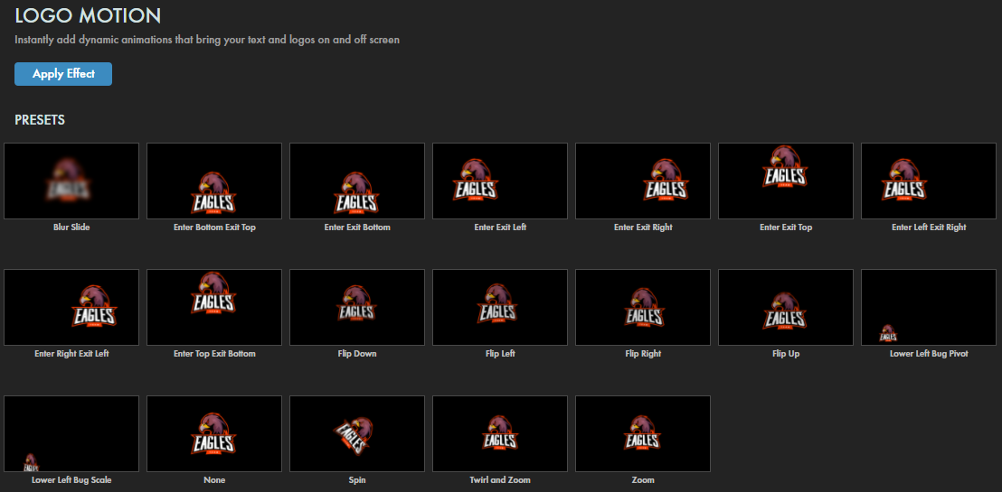 Logo Motion delivers a host of presets to get your graphics animated in seconds. Then, if you like, just tweak the parameters to taste. Find our presets via the blue Open Dashboard... button or the Choose a Preset... button below it.