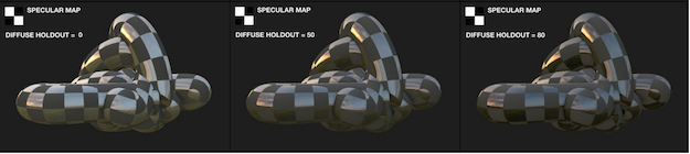 Diffuse Holdout, when increased, will decrease diffuse light in areas where specular and reflected light are high. This can be useful when using texture maps (found in the Textures group), such as specular maps. The image below shows different settings for Diffuse Holdout for two different environments and with a checkered specular texture. Notice how the diffuse light decreases in reflective areas but remains unaffected in non-reflective areas when Diffuse Holdout is used.