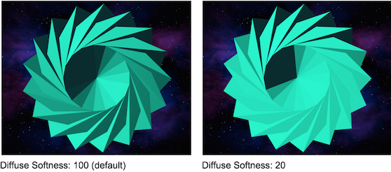 Diffuse Softness sets the softness of the diffuse light. A setting of 100 is the default and creates a soft diffusion. A lower setting (of 20, for example) gives a sharp edge where diffuse lights abruptly change from completely on to completely off. Lower settings can simulate the sharp diffuse reflection of the moon, as in cartoon-style looks, for example. Higher values than 100 can be set but have no known physical correspondence.