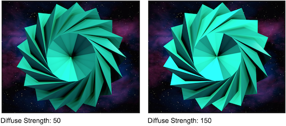 Diffuse Strength adjusts the intensity of the diffuse map. Higher Diffuse Strength values add more light to places on the geometry where brighter values are mapped.