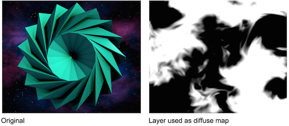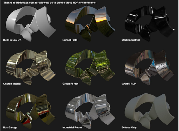 If Built-in Environment is set to None, you can choose a layer to use as a custom reflection map using the Reflection Environment Map pop-up menu. Any image can be selected, but to make a correct environment map it should be a spherical map (also called a “lat/long map” or an “equirectangular map.” A “sphere map” is something else). Note that using a very large environment map consumes a lot of GPU resources.