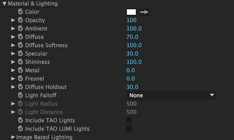 The Light Falloff pop-up menu decides if and how After Effects lights dim, or “fall off,” as distance increases from the light source. The settings behave like After Effects’ Falloff parameters. Light Falloff only supports Point lights. There are three Falloff modes: