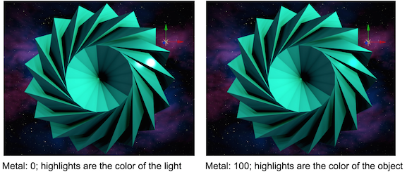 Metal controls how the material transforms the color of the reflected light. If set to zero, colors remain unaffected by the material, such as plastic materials or perfect mirrors. If set to 100, the incoming light will be completely transformed into the color of the material, which is an attribute of metallic surfaces. This setting affects both specular reflections from AE lights and IBL environment reflections.