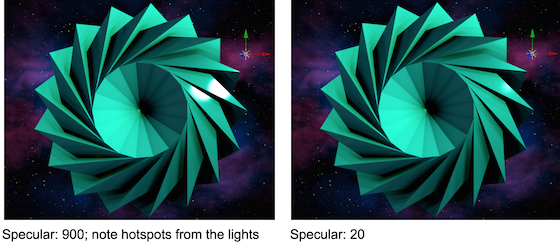 Specular reflection is the mirror-like reflection of light on a surface. When turned up, the geometry appears more glossy, like plastic or metal. Turn the Specular amount to 0 and the mesh becomes matte and almost paper-like. High values make the mesh look more glossy. You may need to lower the Diffuse value to allow highlights to come through. NOTE: Specular controls are only available in Smooth or Flat Shader modes (Rendering > Shader).