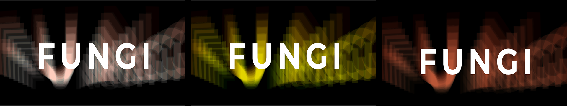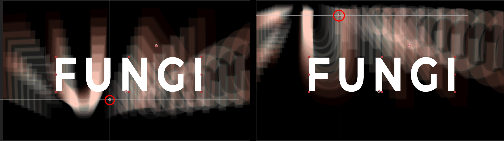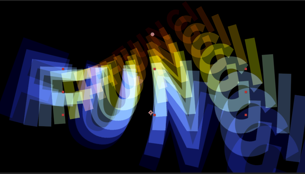 Start Rotation controls the rotation at the start position. Along with End Rotation, you might think of this as twisting on two ends of a rubber shape. In the next image (which uses Chroma Style: Chromatic Spectrum), we set Start Rotation to -35 degress, giving the smaller red word a bit of a counter-clockwise twist. At the other end of the effect, we used 75 degrees to give our larger blue FUNGI a clockwise tilt.
