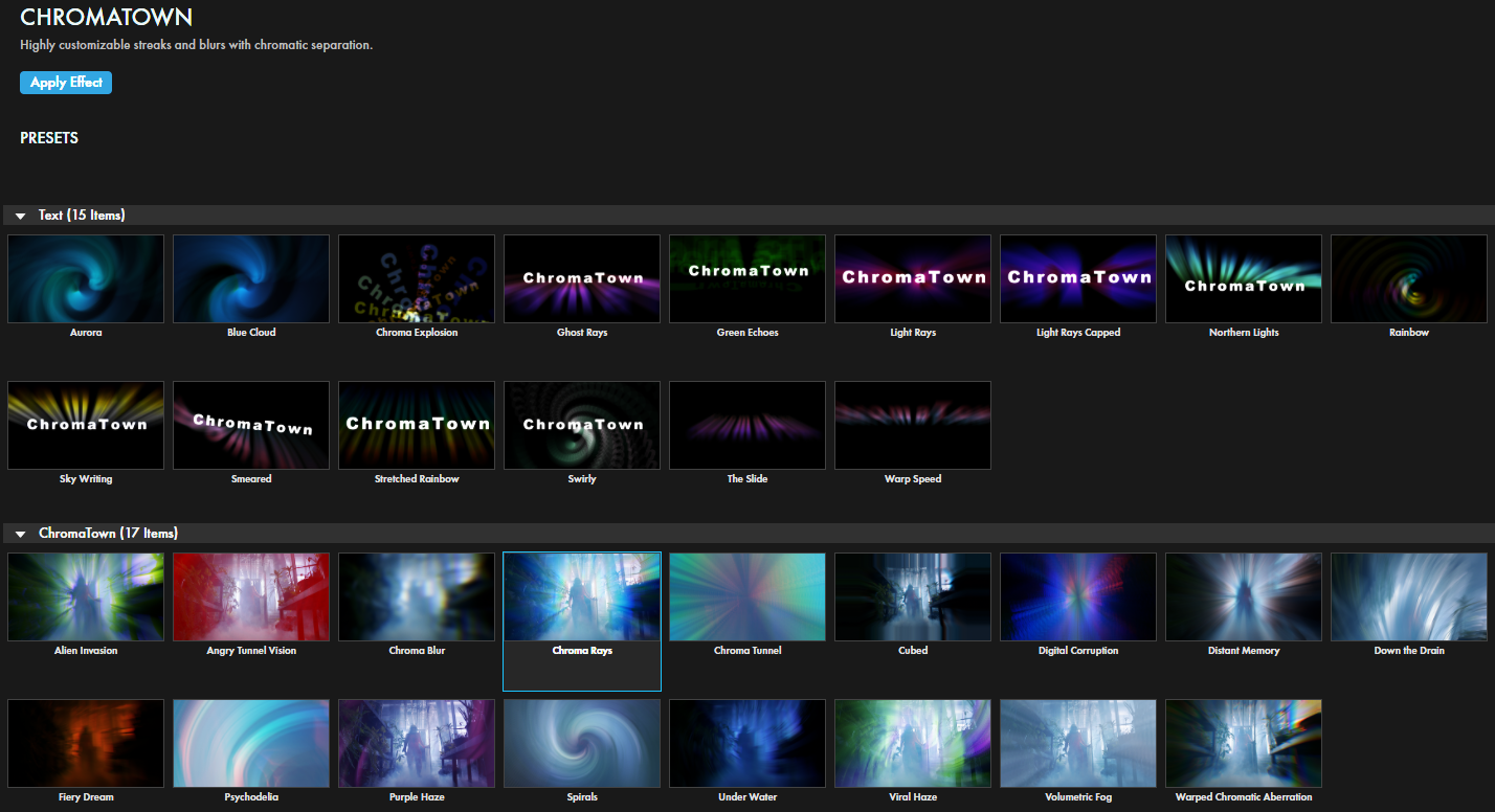 ChromaTown offers a host of handy shortcuts that will make your text and imagery pop with drama. Locate ChromaTown's presets in the Red Giant Universe Dashboard (accessible via the blue Open Dashboard... button or the Choose a Preset... button below it).