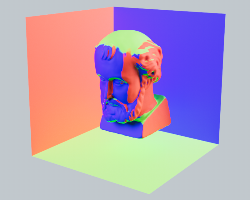 The following illustration clarifies the principle. The colored areas indicate the material that is projected onto the object along the X, Y, and Z directions. The different areas of the object are captured by this projection according to their inclination to these three main planes.