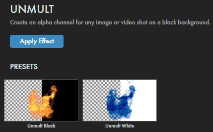 Unmult offers two easy presets for turning black or white backgrounds into transparent alpha channels. Find them via the blue Open Dashboard... button or the Choose a Preset... button below it.