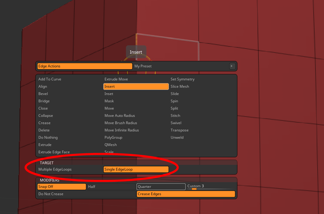 The Insert Action uses two Targets: Multiple EdgeLoops and Single EdgeLoop (circled below). If using the Multiple EdgeLoops Target, you will have access to modifiers that help generate advanced shapes.