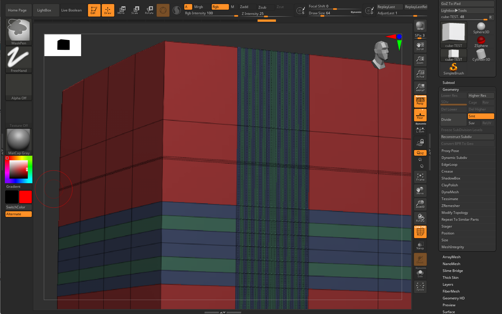 - Interactive Resolution, Optimal Resolution, Resolution Value: Define the resolution (tessellation) of the geometry, with it either being interactive or automatically controlled by ZBrush.