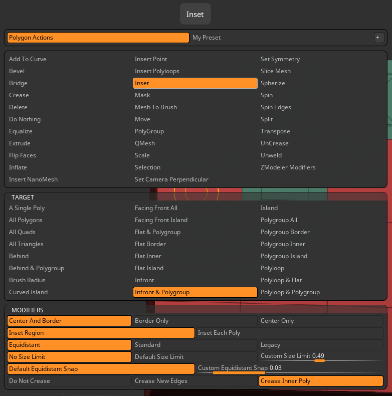 - All Faces, Polygroup Border, Polygroup Inner: Define the behavior of the creased edge, based on the existing PolyGroups for the selected Target.
