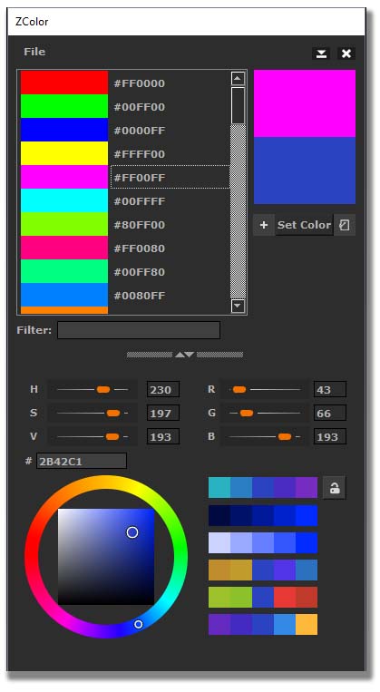 The Swatches folder located in the ZBrush 2019\ZStartup\ZPlugs64\ZColorData_2019\ folder contains two example ZColor *.zco files. The file named ID-colors.zco contains colors that are separated numerically, making it suitable for assigning material or color IDs as used in some other programs.