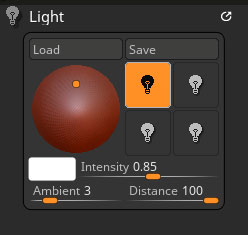 The Light palette provides up to 4 lights, as well as modifiers for customizing them. Select lights, and turn them on or off, by clicking on them. The current lighting setup, containing all 4 lights, can be saved to a single disk file. Similarly, all 4 lights can be replaced by loading a file from disk.